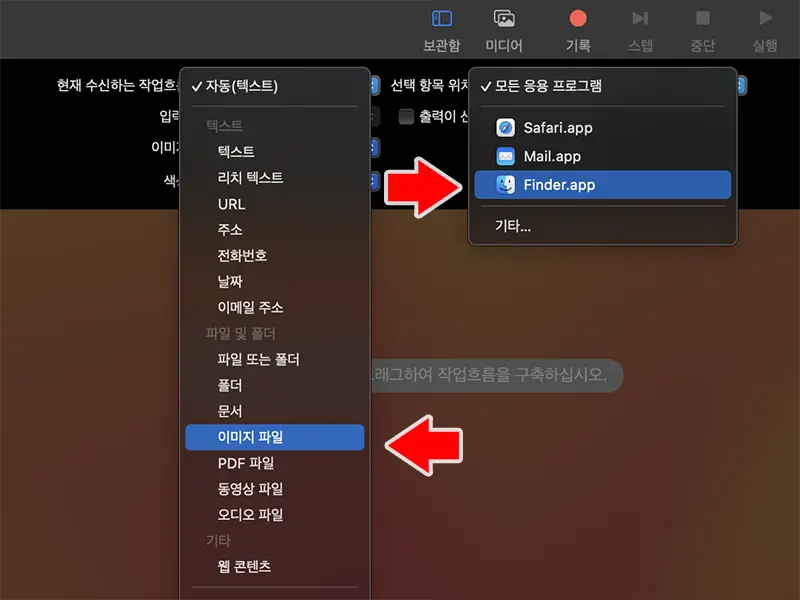 파인더에서 이미지 파일을 선택해 jpg로 변환할 워크플로우를 구성할 것이기 때문에 우측의 패널❷ 에서 현재 수신하는 작업흐름 항목에서 이미지 파일을 선택하고 선택 항목 위치는 Finder.app을 선택해주면 된다.