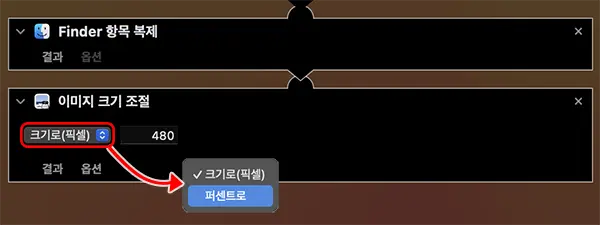 "이미지 유형 변경" 동작을 추가할 후 이미지 크기 조절을 위한 옵션을 선택해준다.